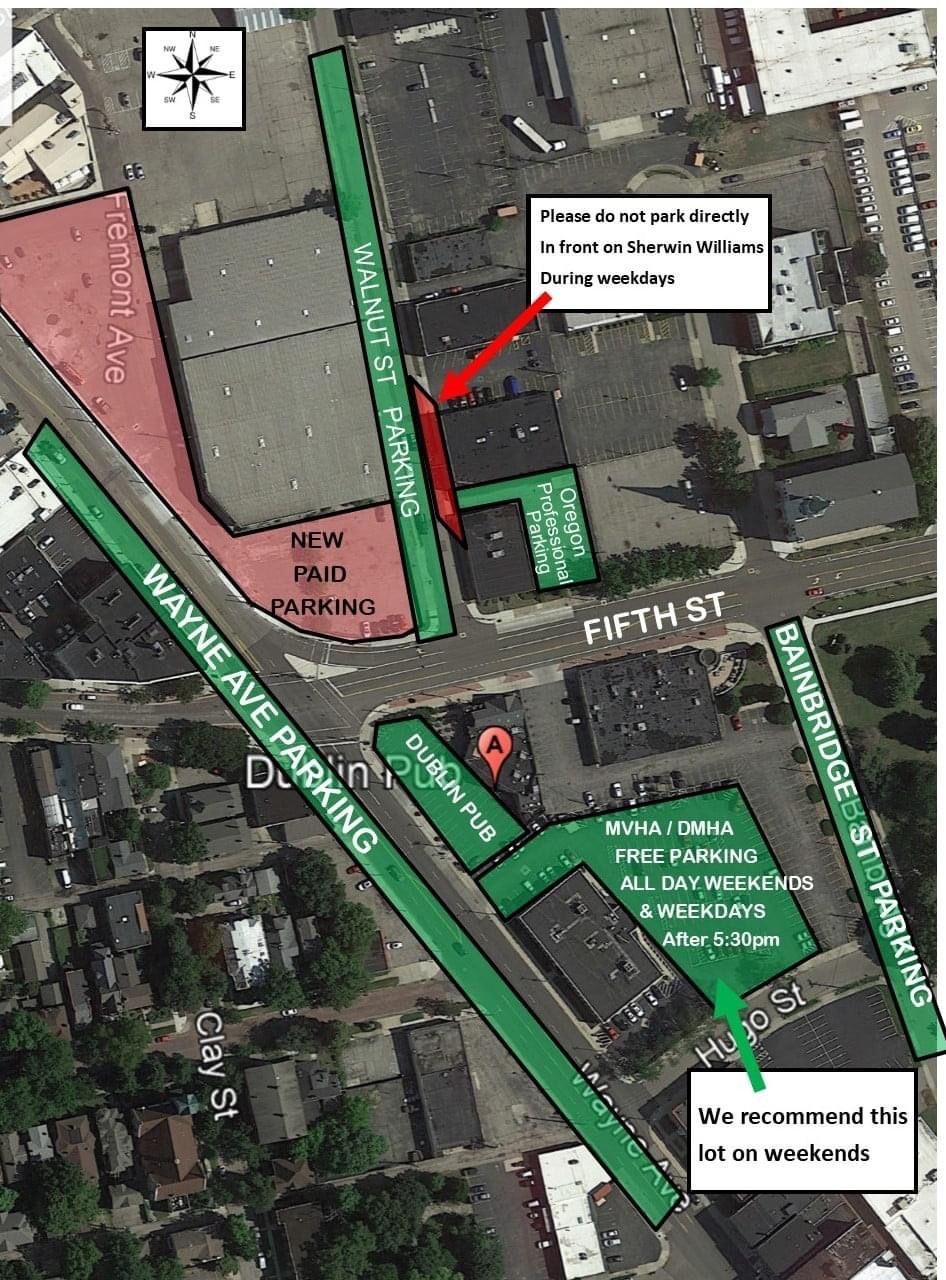 There is free parking in the front, sides, and back of Dublin Pub. Please avoid parking directly behind Jimmy's Italian. Use the lots shown in green on map. Wayne Ave has free parking and Walnut Street has free parking. Please avoid parking directly in front of Sherwin Williams on Walnut street.